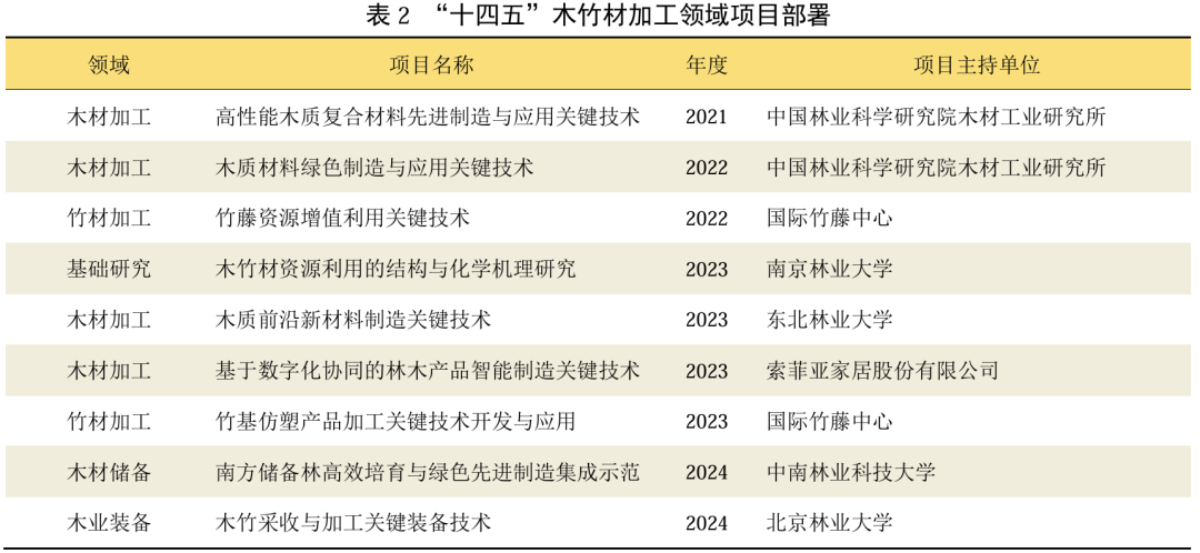 “十四五”期间国度沉点研发打算林业专项“林业种质资本培育取质量提拔科技立异”,以提质量、扩面积、强功能、增价值为方针,从7个范畴(计谋品种创制、资本质量提拔、经济林提质增效、财产绿色成长、生态宜居村镇、区域集成示范和突发应急使命)摆设了41项使命,木竹材加工范畴的沉点使命集中正在财产绿色成长和区域集成示范板块,正在木材加工、竹材加工、林业配备和根本研究范畴摆设了9个项目(表2)。项目标实施将提拔木竹资本的操纵率和产物附加值,无力鞭策木竹加工财产的绿色成长和科技立异,为财产升级奠基根本。
